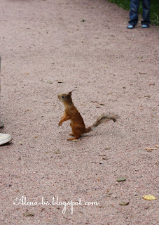 В Петергофе поразили белки! Наглые, смелые! Одна из них выскочила на дорожку, где ходит толпа народу и стала бессовестно попрошайничать!
